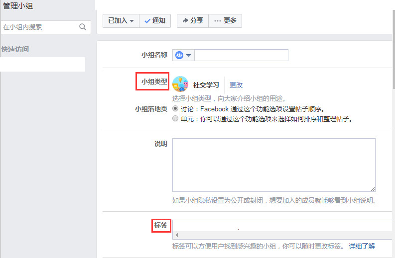 创建一个小组后,可以把小组归类,这可以帮助潜在成员找到并和了解小组用途。类型包括买入和卖出,父母,邻居,学习小组,支持,习惯等等。